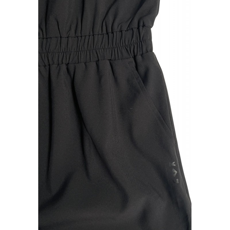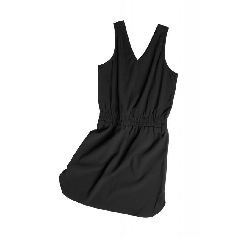 Semi-fitted sleeveless dress, elastic waist, v-neckline, front pockets, curved hem, length hits mid-thigh.