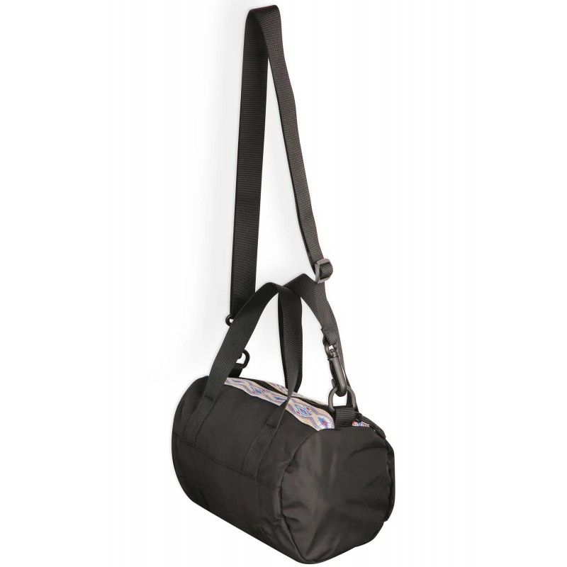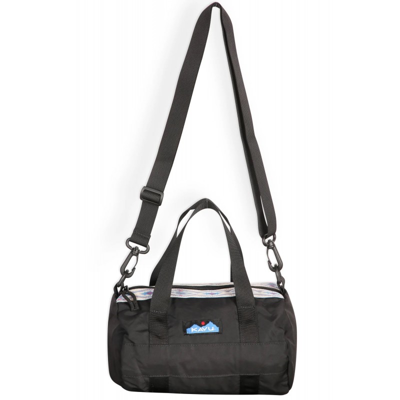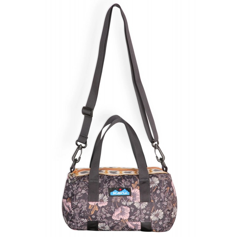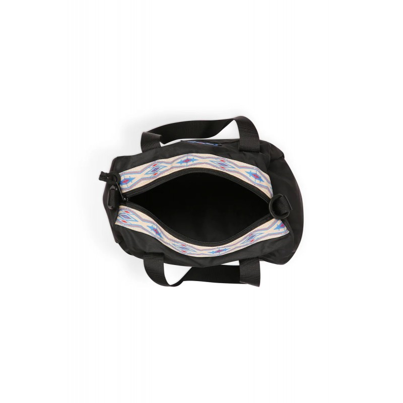 Cross body bag tiny duffle with adjustable webbing shoulder strap that can detach, plastic d-ring and snap hook hardware, fixed hand straps, main compartment with zip closure, rope loop zip pull and pattern webbing detail