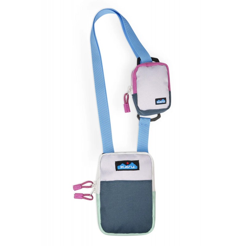 2 n 1, modular "wear your way" cross body pouches connected with an adjustable webbing shoulder strap that can detach and can convert to belt bag, plastic tri slide and carabiner hardware, small pouch with zip closure, large pouch with main compartment zip closure, one front slip pocket and one internal zip pocket, rope loop zip pulls and pattern webbing details.