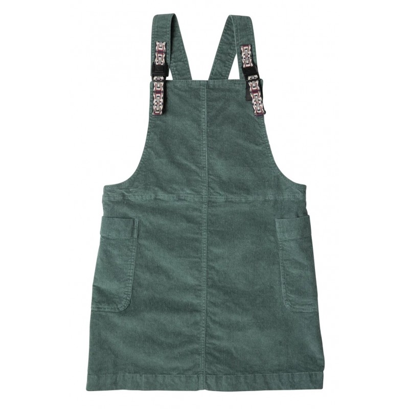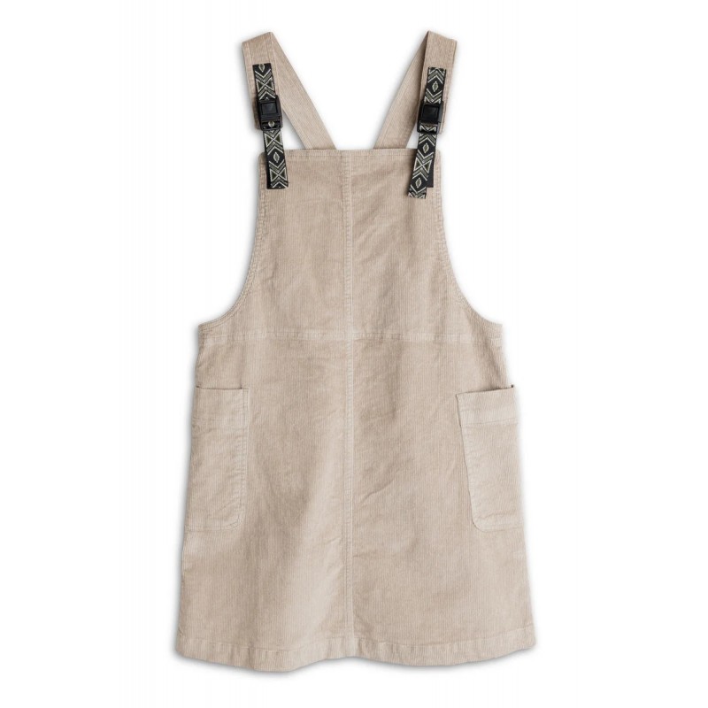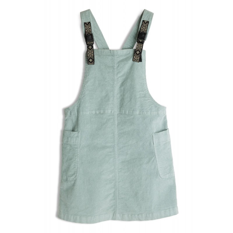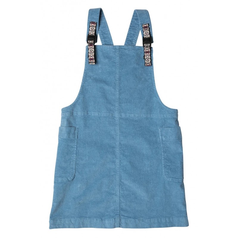 Relaxed fit jumper dress, adjustable webbing shoulder straps and buckle closure, two side patch pockets, length hits mid-thigh.