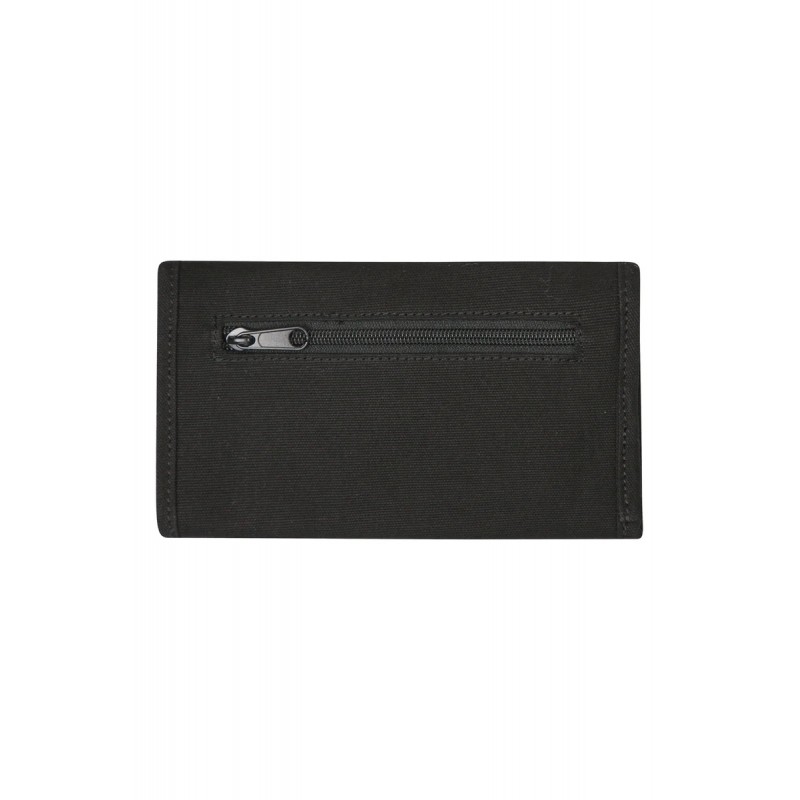 100% Cotton. Hey, big spender! Tri-fold wallet with snap closure, internal cash and checkbook slots, credit card and ID holders, pen slot and one external zip pocket.