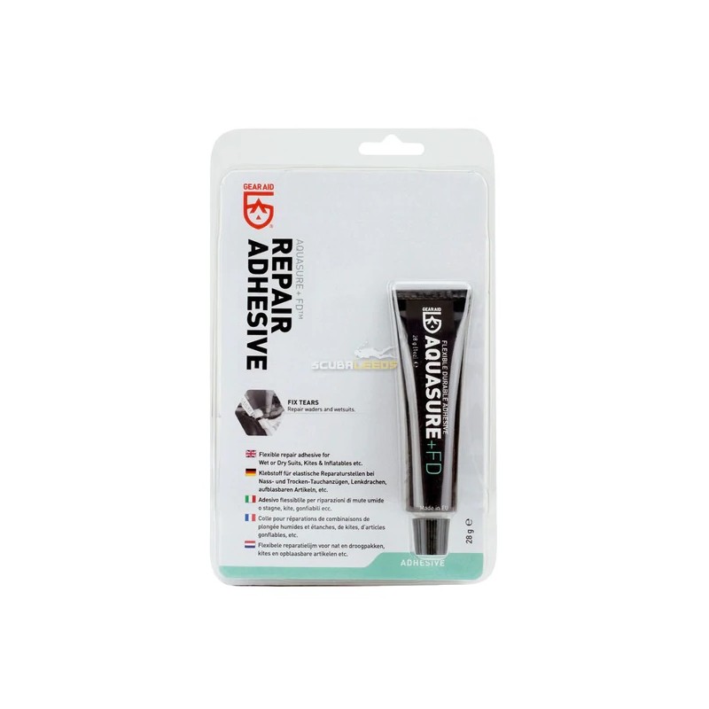 Waterproof urethane adhesive for permanent repairs on drysuits, wetsuits and outdoor gear. Cures into a flexible rubber glue with excellent abrasion resistance.