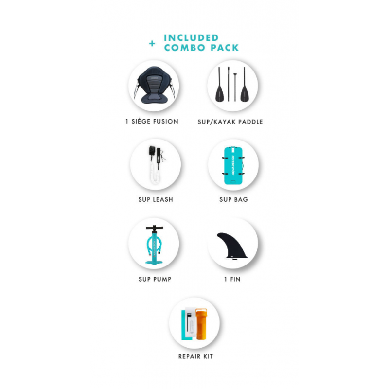 | Pacchetto Combo | Sedile Fusion, pagaia 3 pezzi, pompa 15 PSI, borsa SUP, leash, pinna, kit di riparazione |