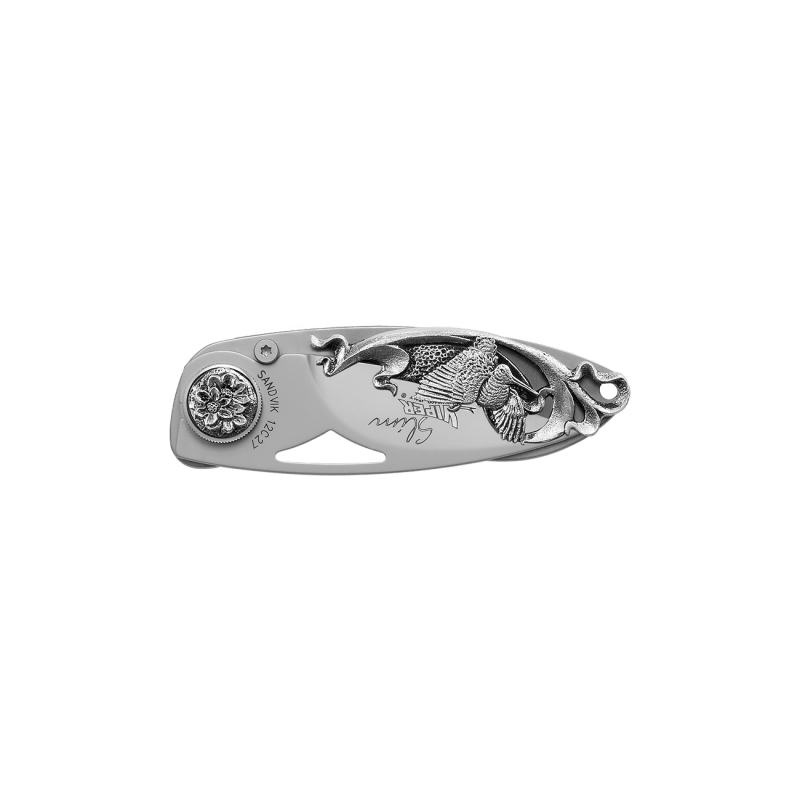 Coltello pieghevole compatto con lama in acciaio Buderus NITRO B finitura sabbiata e blocco framelock. Il manico presenta un inserto in legno woodcook con cornice in argento 825. Coltello ultra leggero, lavorazione di precisione, fornito in astuccio metallico nero.