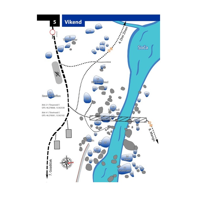 The climbing guide is dedicated to bouldering along the Soča river, near the village of Trnovo ob Soči in Slovenia. The boulders were first discovered by Gašper Bratina, who, together with climbers from the Gorica region, began cleaning and climbing them as early as 2009. Today, the climbing area offers more than 1000 quality bouldering problems, with some still unclimbed and waiting for the strongest climbers. In the future, we can also expect an expanded version of this guide, as potential boulders and even sectors are still being discovered.