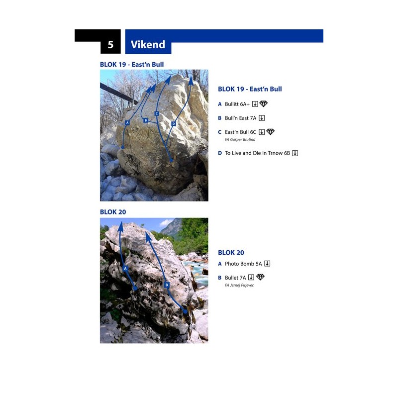 The climbing guide is dedicated to bouldering along the Soča river, near the village of Trnovo ob Soči in Slovenia.
