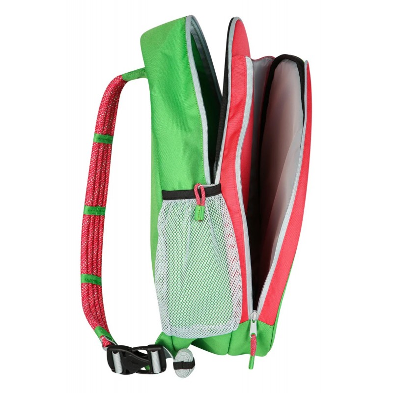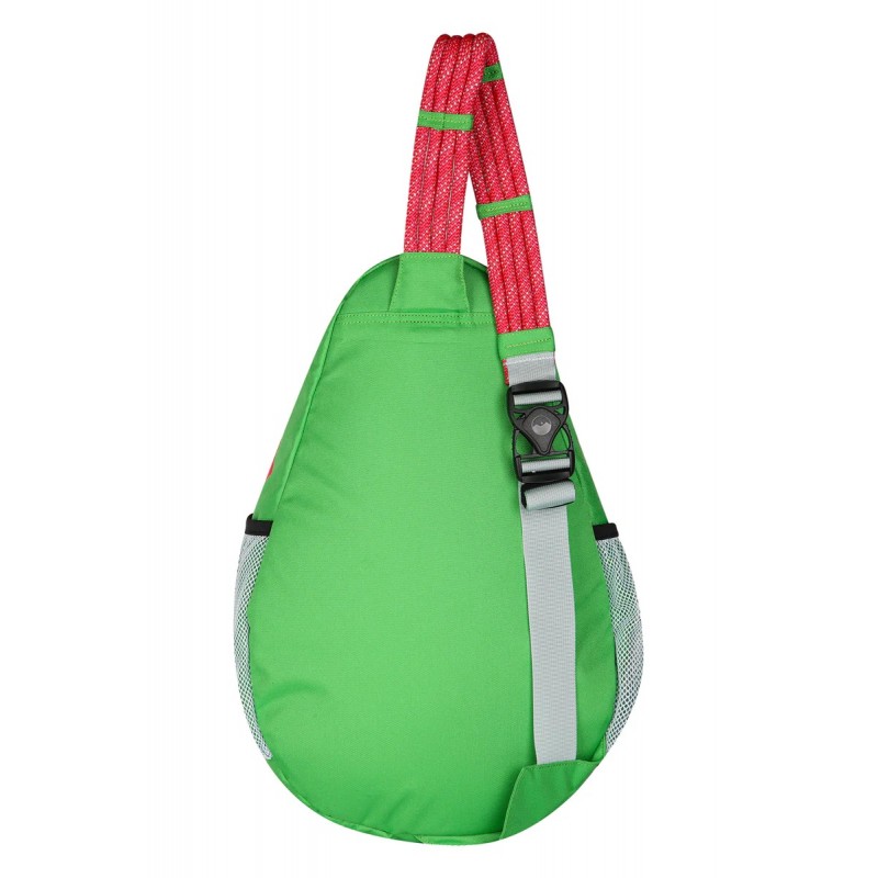 Semi padded sling pack racket bag, adjustable rope shoulder strap and side release buckle, elastic webbing keeper at strap end, main compartment with two-way zip closure for racket storage, two exterior zip pockets and two mesh side pockets for water bottle / tennis balls, internal mesh slip pocket with pattern webbing loop key clip, internal zip pocket, rope loop zip pulls