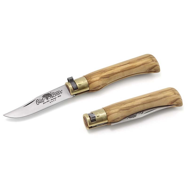 Zložljiv nož Old Bear® velikosti XL, s satensko brušeno rezilo iz nerjavečega jekla AISI 420 ter ročajem iz oljčnega lesa, obdelanim z oljnim premazom. Sistem varovanja rezila je patentiran medeninast varnostni obroč, ki omogoča zaklep tako v odprtem kot zaprtem položaju. Izdelava poteka ročno, zato je vsak kos unikaten.