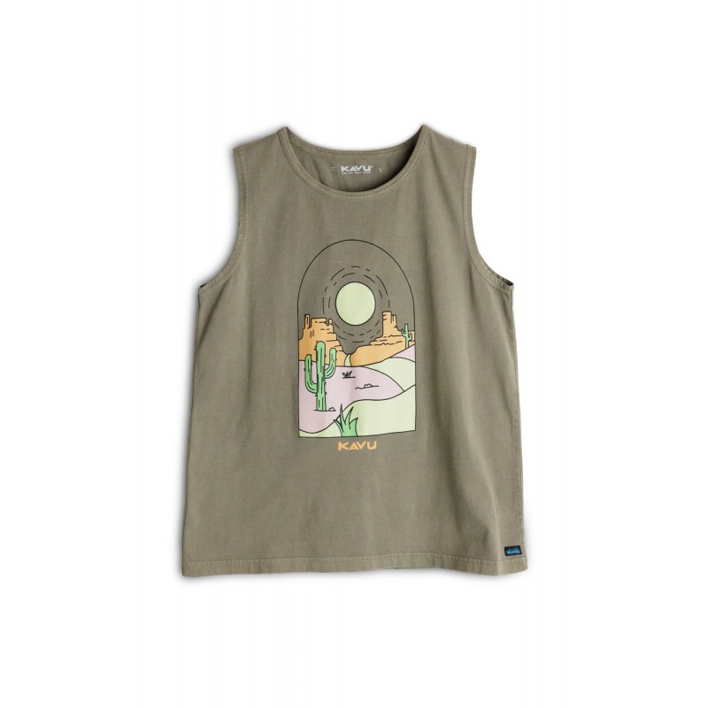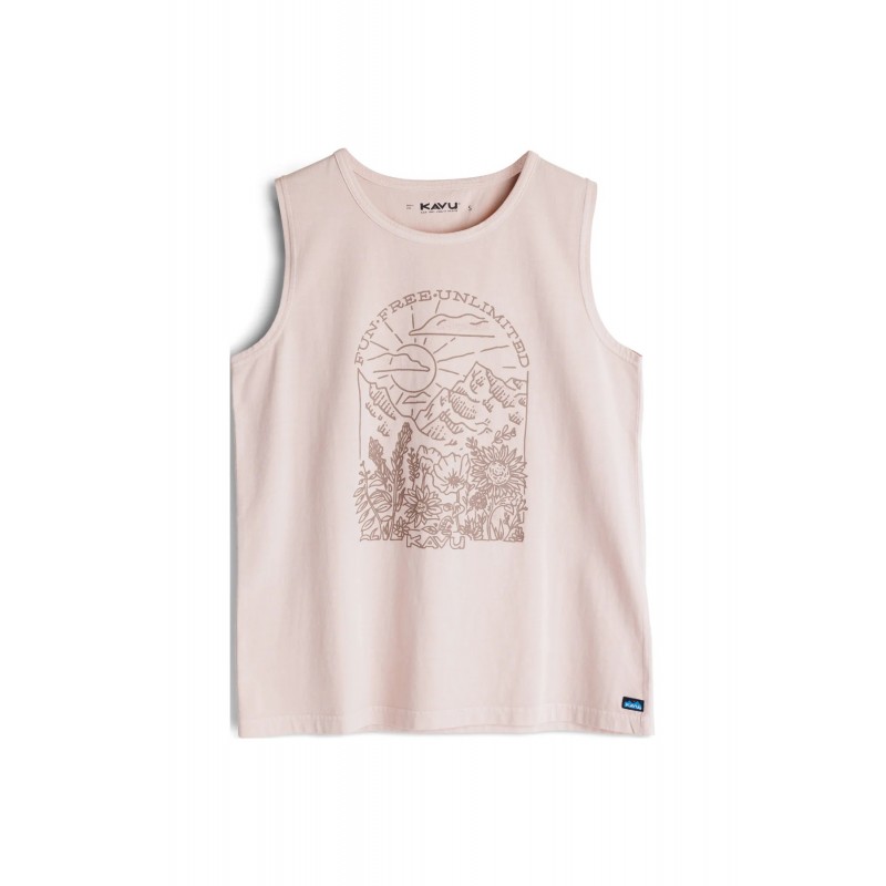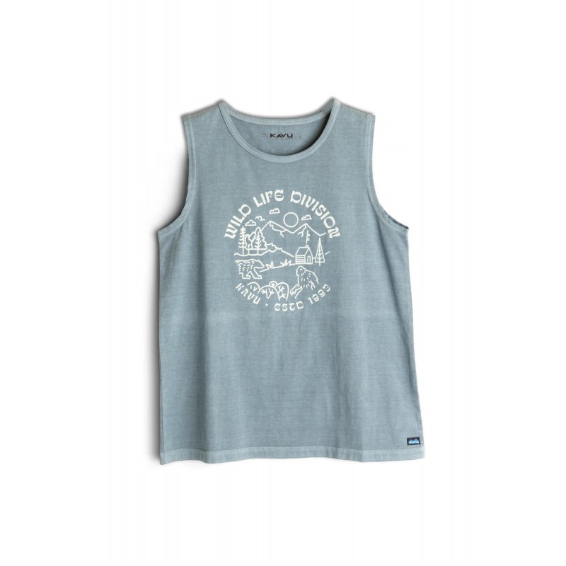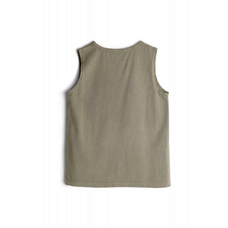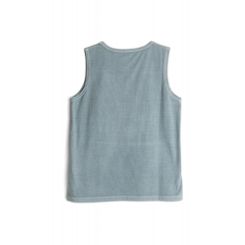 Semi-fitted tank top, self-fabric binding at crew neckline, screen print on center front chest, straight hem, heat transfer back neck label.