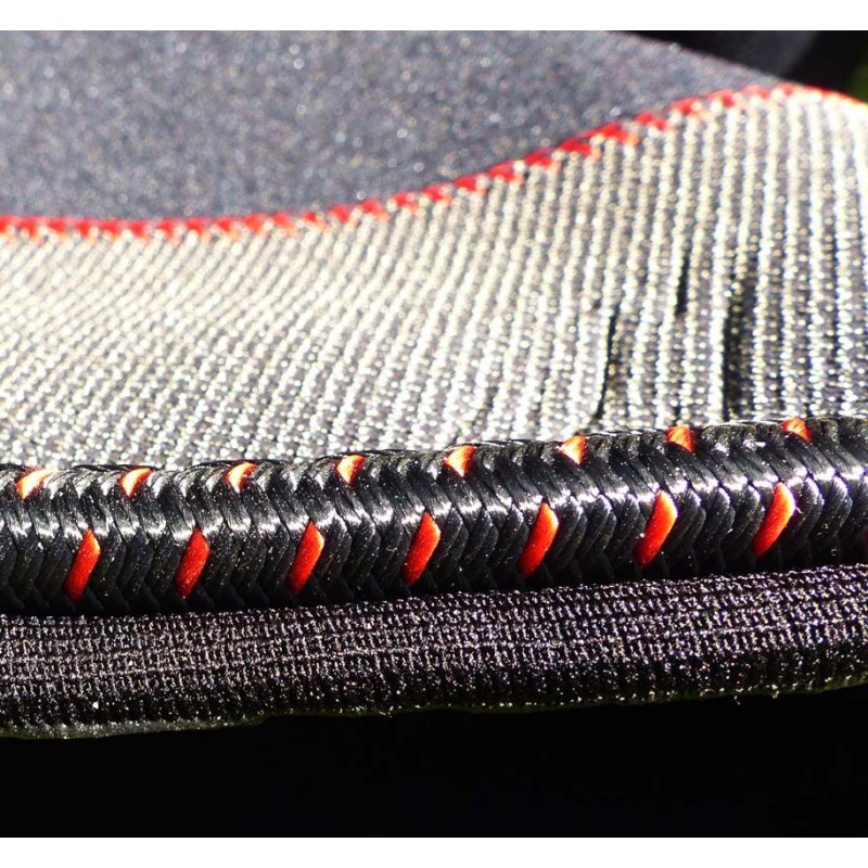 Neopren je najprej lepljen, nato pa obojestransko prešit. Ta postopek zagotavlja 100 % vodotesnost brez potrebe po dodatnem lepilnem traku. To omogoča posebna šivalna tehnika z ukrivljeno iglo, ki ne prebode neoprena. Na spodnji strani je ročno nanesen debel sloj lateksa z značilno rebrasto strukturo — znak visoke kakovosti.