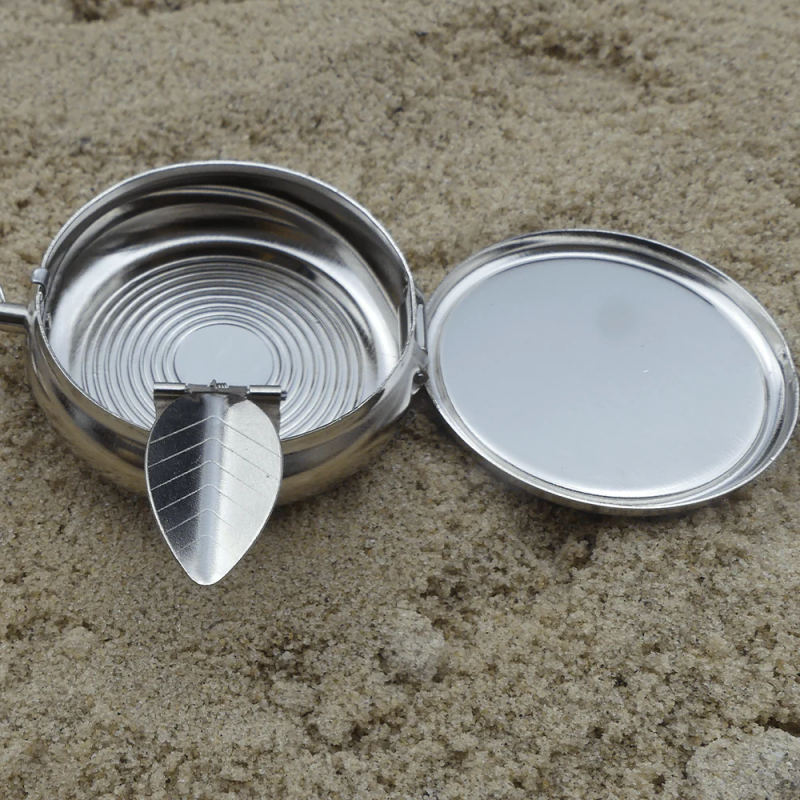 Praktičen okrogel žepni pepelnik, premera 5 cm in višine 1,5 cm, z zložljivim pokrovom, izdelan iz nerjavečega jekla. Idealen za outdoor, potovanja in plažo. Cigaretni ogorki ne sodijo v naravo. Poskrbi za čisto okolje: odpri, odvrzi ogorek, zapri – končano.
